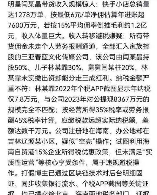一边住着豪宅、满身大牌,一边对着镜头哭穷,这波“炫富式卖惨”直接把网友的火气点燃了,更让人反感的是,她早年在节目里还公然嘲讽穷人,说“老农民好好种地,一年挣十几万二十万,比城里打工强多了”,甚至反问观众“我都住三亚了,还是农村人吗?”。双标言论配上奢靡的生活,闫学晶的“亲民”人设彻底崩塌,全网群嘲的同时,也有人顺着这条线索深挖,这一挖,直接挖出了更劲爆的偷税漏税黑料。2026年1月13日晚,打假博主“打假先生”向北京、海南两地税务部门递交了实名举报材料,耗时两个多月调查的证据链,把闫学晶家族的避税操作扒得底朝天。 博主曝光,闫学晶在某平台的直播带货总销量高达1278万单,按最低佣金估算年进账超7600万,按平均佣率算毛利更是约1.2亿,可这笔巨额收入,却没有走个人劳务报酬通道缴纳45%的个税,而是全部划转至一家名为三亚春蓝文化传媒的有限公司。这家看似注册在海南、能享受自贸港15%企业所得税优惠的公司,实则就是个空壳子:注册地在海南,真实办公地却藏在吉林辽源的老旧小区里,只有几张破桌子,连正经员工都没有,典型的“挂羊头卖狗肉”。更耐人寻味的是这家公司的股权结构,妥妥的家族闭环:闫学晶持股50%,儿子林傲霏持股30%,她的舅舅代持20%,而林傲霏甚至未实缴出资,却能分走三成红利。
