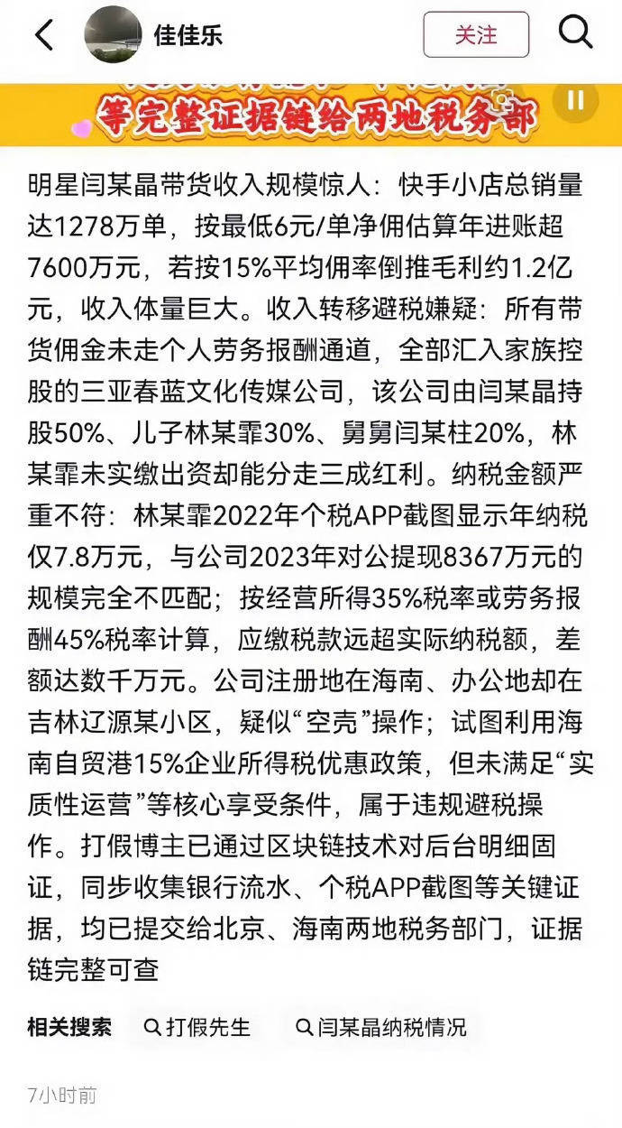 最离谱的是纳税金额的悬殊:2023年林傲霏从这家公司对公提现8367万元,可2022年的个税APP截图显示,他全年仅缴纳个税7.8万元,按经营所得35%或劳务报酬45%的税率计算,应缴税款和实际纳税额相差数千万元,差距超千倍。明眼人都能看出来,这是借着家族公司的名义,把个人收入包装成企业收入,违规利用税收政策避税,手段和当年的薇娅、雪梨如出一辙,甚至更为隐蔽。博主还通过区块链技术固定了后台明细,同步收集了银行流水、交易明细、股权证明等关键证据,1月14日公开的举报视频里,连和税务部门的联络凭证都一并放出,确认举报已被正式受理。消息一出,全网哗然,网友纷纷跑到税务官微留言追问,大家都以为,这次闫学晶插翅难飞。 可就在众人坐等处罚结果时,事情却出现了短暂的反转:2月初有博主查询国家税务总局官网,发现上面并没有关于闫学晶的任何公示信息,只有另外两起主播偷税案的通报。一时间,网友各执一词,有人说她被冤枉了,也有人认为税务调查需要时间,真相还未浮出水面。经北京、海南两地税务部门联合核查,闫学晶偷税漏税的事实被正式确认:2022至2024年期间,她通过拆分合同、利用空壳公司走账等方式,隐瞒直播收入高达3800万元,最终被依法追缴税款、滞纳金及罚款,总计近1.2亿元,要求在1月底前缴清。目前闫学晶已经足额缴纳了这笔天价罚单,也正因如此,才逃过了牢狱之灾。不过这场风波的遗留疑点,至今仍未解开:官方并未明确说明,闫学晶早年的演艺收入、商演报酬是否也存在偷税漏税行为,这也成了网友心中的一个结。